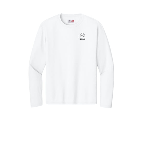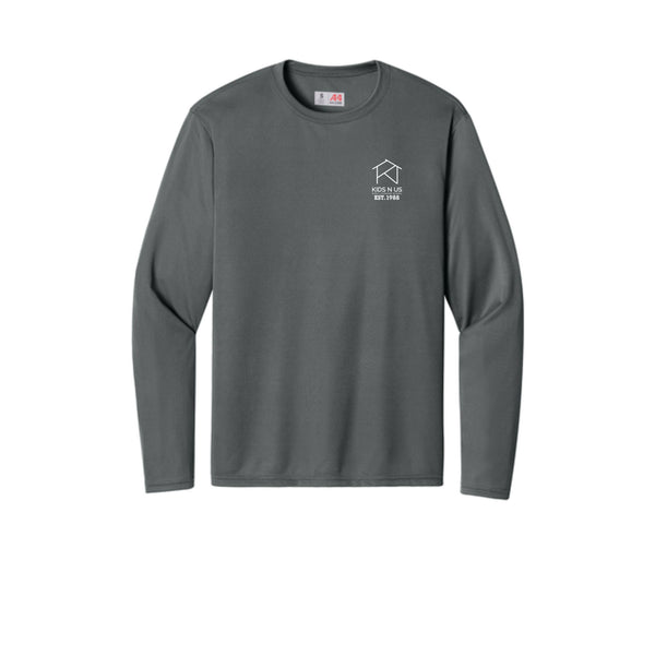 A top choice for sports and exercise, this long sleeve tee combines a comfortable fit with performance features such as moisture wicking and sun protection. The Kids N Us logo is printed on the left chest.